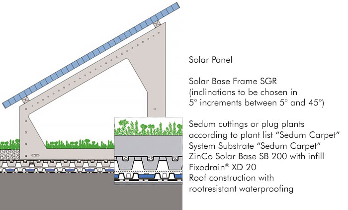 With its Solar Base, Zinco incorporates solar energy into green roofs and creates synergies, whether it is for generating electricity (photovoltaic) or for heating and hot water applications (solar thermal). The height of the Solar Base Frames creates enough distance between the substrate layer and the solar panels, providing the plants with enough sunlight and rainwater and enabling appropriate maintenance.